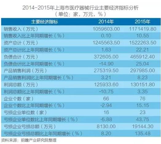 2015年上海市醫療器械行業的銷售收入、資產總額和利潤總額較上年均有不同程度的提升。根據國家統計局統計,2015年上海市醫療器械行業規模以上企業數量有76家,較上年增加10家;實現銷售收入117.14億元,同比增長10.55%;實現產品銷售利潤29.80億元,同比增長8.23%;利潤總計為13.02億元,同比減少3.35%。(具體數據指標詳見下表。)