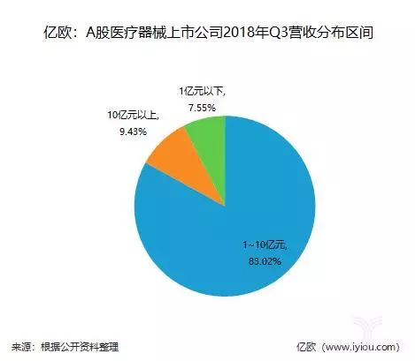 將A股醫(yī)療器械上市公司2018年Q3營收分為三個區(qū)間,分別是1億元以下、1~10億元、10億元以上,對應(yīng)的占比為依次為7.55%(4家)、83.02%(44家)、9.43%(5家)。其中,1~10億元區(qū)間里,營收范圍在1~5億元的企業(yè)有36家。總體而言,各區(qū)間之間呈現(xiàn)明顯的梯度差異。