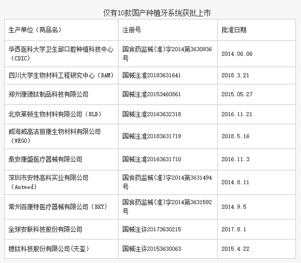 第二,目前多數(shù)植牙患者的收入水平較高,而且患者和醫(yī)生都較為迷信進口產(chǎn)品,特別是對于需要長期留在體內(nèi)的種植體耗材,不少患者更愿意多花幾千元而使用進口材料;