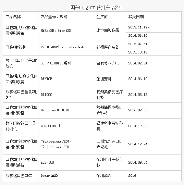 與其他影像診斷設(shè)備市場相似,我國的口腔CT主要市場份額長期以來被卡瓦、西諾德等進口品牌占據(jù)。受益于口腔醫(yī)療行業(yè)的快速發(fā)展,我國口腔CT的市場規(guī)模近年來呈爆發(fā)式增長局面。國產(chǎn)企業(yè)積極把握市場機遇,紛紛涉足口腔CT的研發(fā)制造。目前共有十款國產(chǎn)CBCT產(chǎn)品獲CFDA批準上市,上市時間多集中在2014、2016兩年。