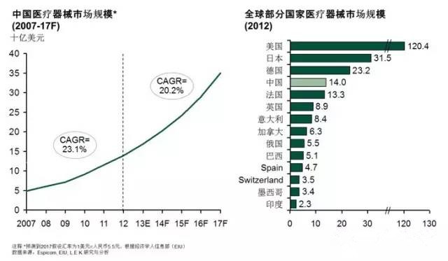 和醫(yī)藥市場(chǎng)一樣,中國(guó)醫(yī)療器械市場(chǎng)在過(guò)去一直保持著快速增長(zhǎng),并且被很多人認(rèn)為是“后勁”更足的一塊。中國(guó)市場(chǎng)在2012年就已經(jīng)是全球第四大醫(yī)療器械市場(chǎng),市場(chǎng)規(guī)模達(dá)到140億美元,并且行業(yè)內(nèi)大多認(rèn)同還能在相當(dāng)一段時(shí)間內(nèi)維持20%以上的增長(zhǎng)。按照這種趨勢(shì)下去,中國(guó)很快就有望成為全球第二大醫(yī)療器械市場(chǎng)。