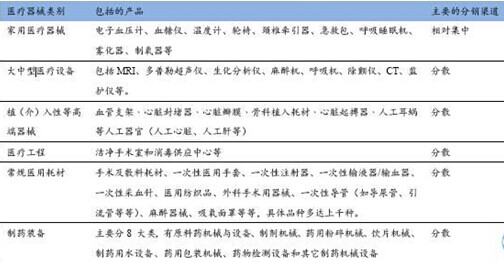 醫(yī)療器械產(chǎn)品種類繁多,主要分為以下六大類:家用醫(yī)療器械、大中型醫(yī)療設(shè)備、植(介)入性等高端器械、潔凈手術(shù)室和消毒供應(yīng)中心等醫(yī)療工程、常規(guī)醫(yī)用耗材、制藥設(shè)備。