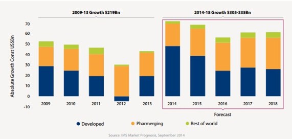 IMS預測,到2018年,全球處方藥銷售將達到1.3萬億美元。這一數字高過2014年世界第15大經濟體墨西哥的GDP1.2萬億美元。