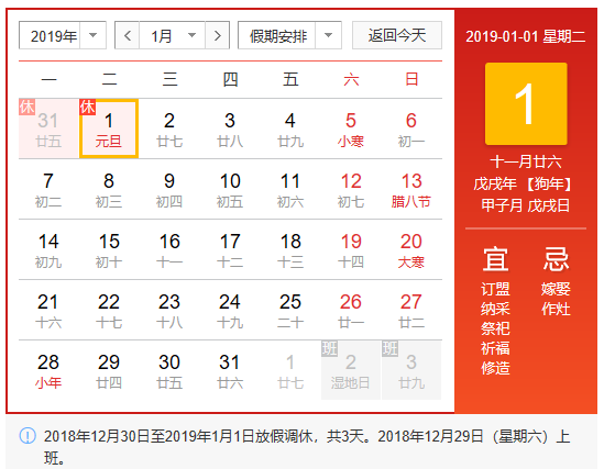 2019年北京華康普美科技有限公司,“元旦”假期為:2018年12月30日(星期日)至2019年1月1日(星期二)放假調休,共3天。2018年12月29日(星期六)上班。
