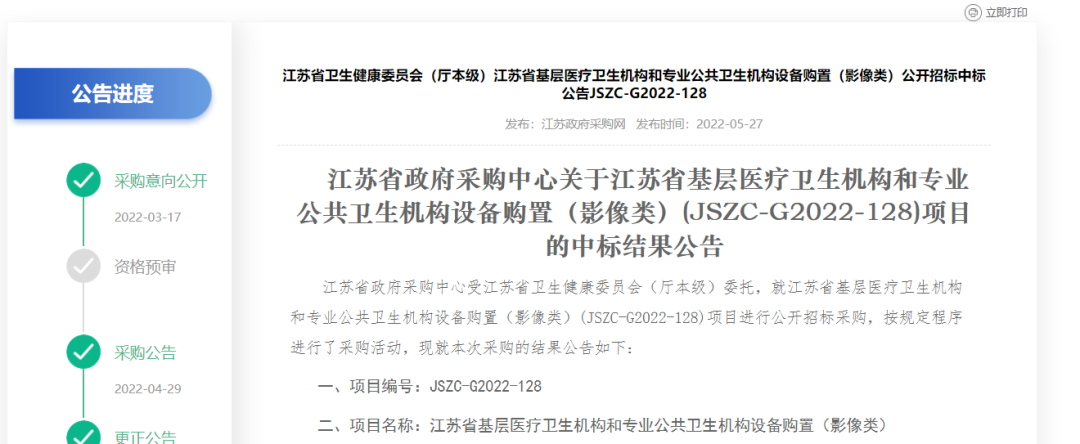 5月27日,《江蘇省基層醫(yī)療衛(wèi)生機(jī)構(gòu)和專業(yè)公共衛(wèi)生機(jī)構(gòu)設(shè)備購置(影像類)公開招標(biāo)中標(biāo)公告》公布,257臺DR、彩超...總預(yù)算高達(dá)1億元的設(shè)備采購大單最終中標(biāo)結(jié)果公布!