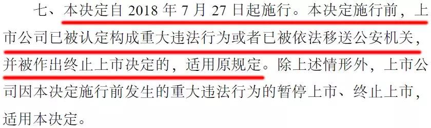 證監會表示,本《決定》施行前,上市公司已被認定構成重大違法行為或者已被依法移送公安機關,并被作出終止上市決定的,適用原規定。除上述情形外,上市公司因本決定施行前發生的重大違法行為的暫停上市、終止上市,適用本決定。