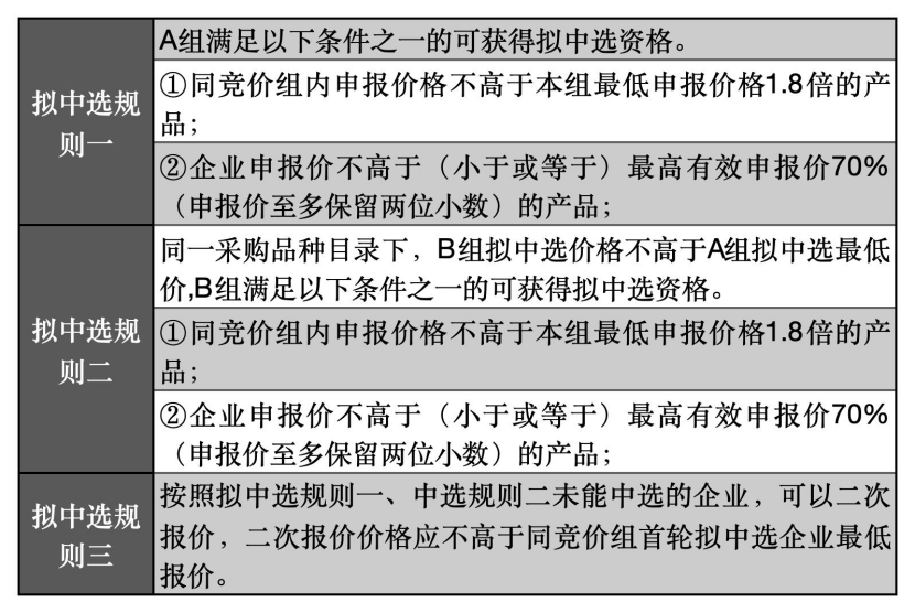 擬中選規(guī)則中,設(shè)置了二次報(bào)價(jià)規(guī)則,給企業(yè)留有一定回旋余地。根據(jù)《征求意見稿》,按照擬中選規(guī)則一、中選規(guī)則二未能中選的企業(yè),可以二次報(bào)價(jià),二次報(bào)價(jià)價(jià)格應(yīng)不高于同競價(jià)組首輪擬中選企業(yè)最低報(bào)價(jià)。