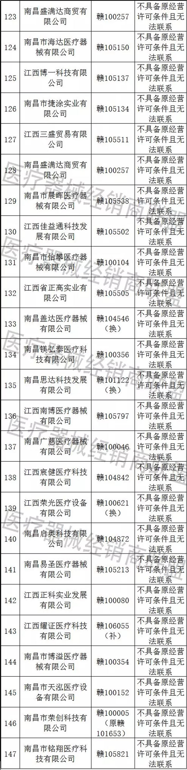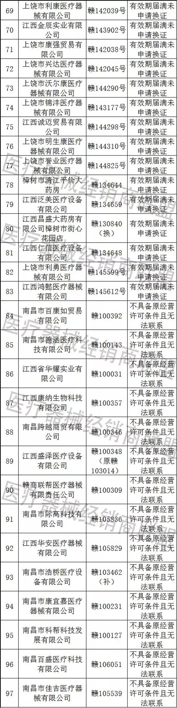 南昌市百康如貿(mào)易有限公司等87家企業(yè)不具備原經(jīng)營(yíng)許可條件且無(wú)法聯(lián)系。